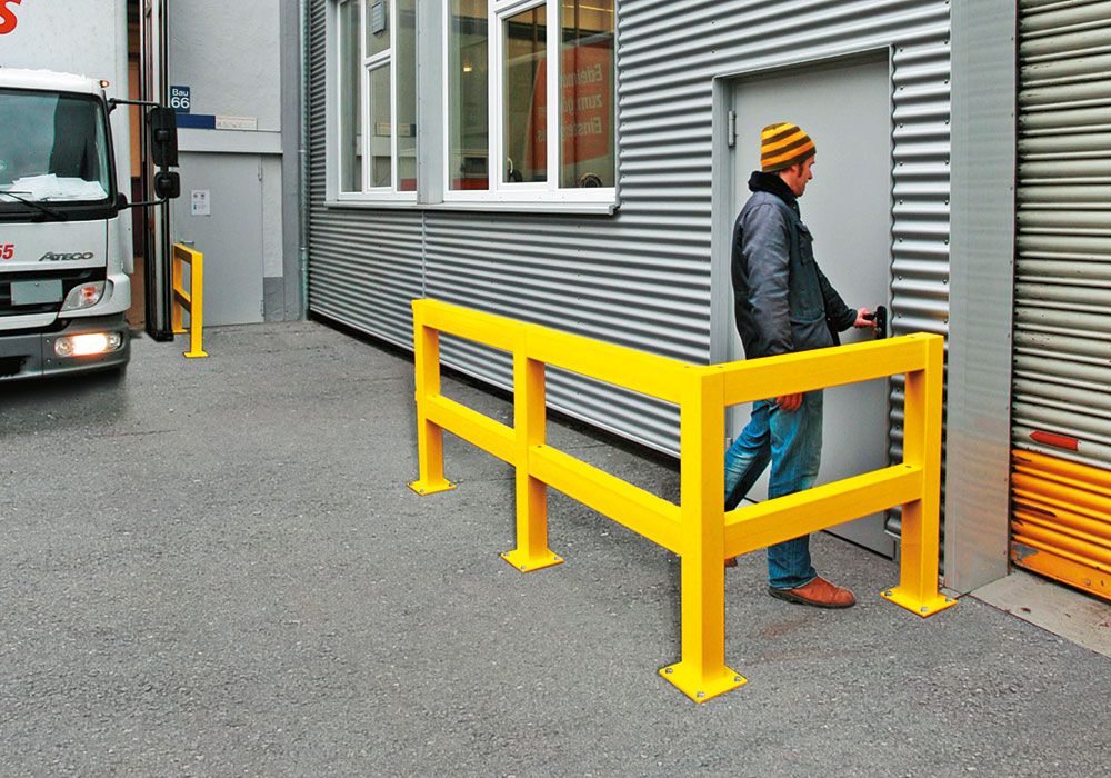 Buitengewoon stevige, massieve beveiligingsbalustrade. Scheidt verkeerswegen (heftruckverkeer/personenverkeer), beschermd werkplaatsen en materialen.