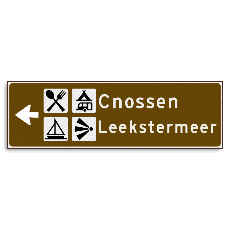 Keuze uit meer dan 250 officiële en bijzondere pictogrammen voor bewegwijzering. Klik hier voor een overzicht en benaming van de pictogrammen.
